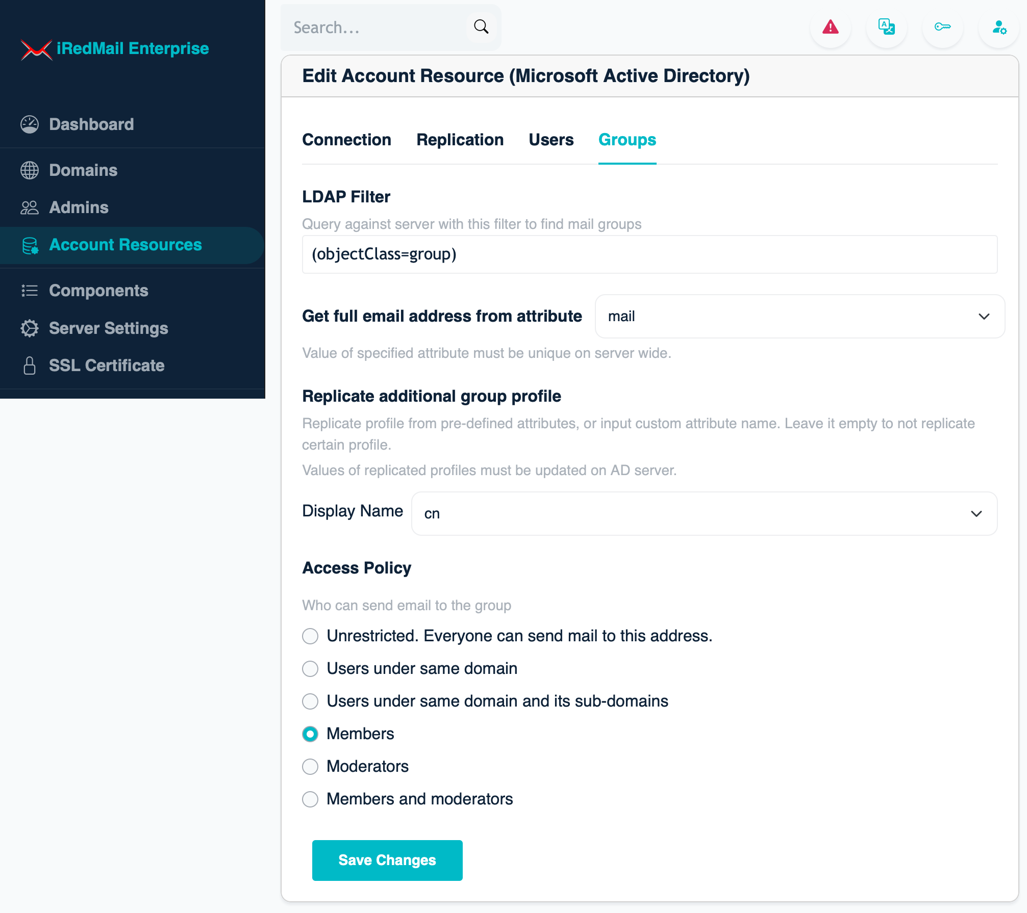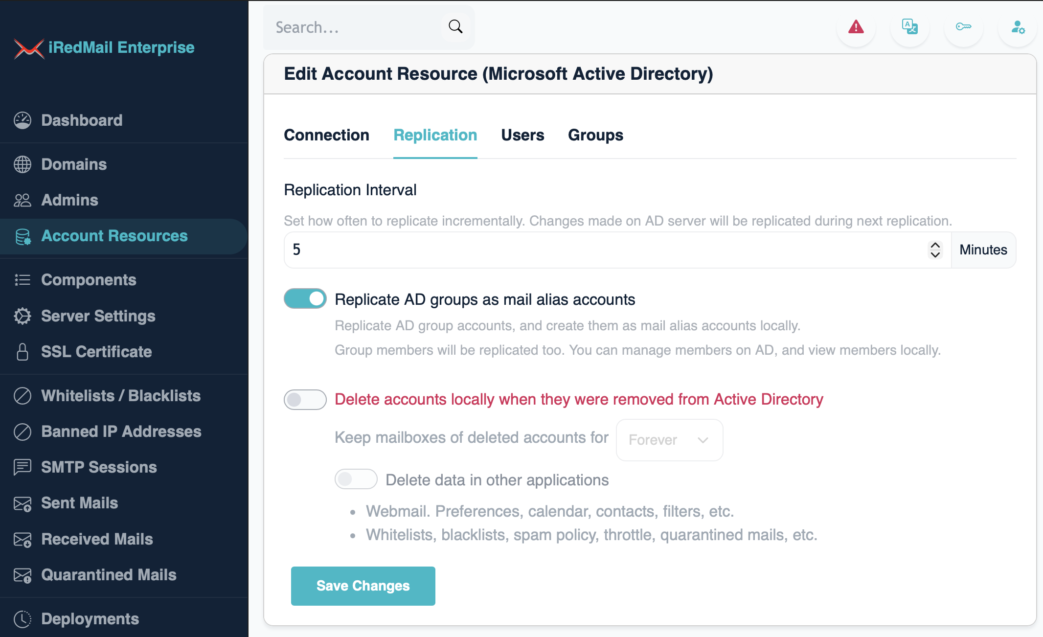 Replication Interval: Set how often to replicate incrementally.Replicate AD groups as mail alias accounts: Replicate AD group accounts,