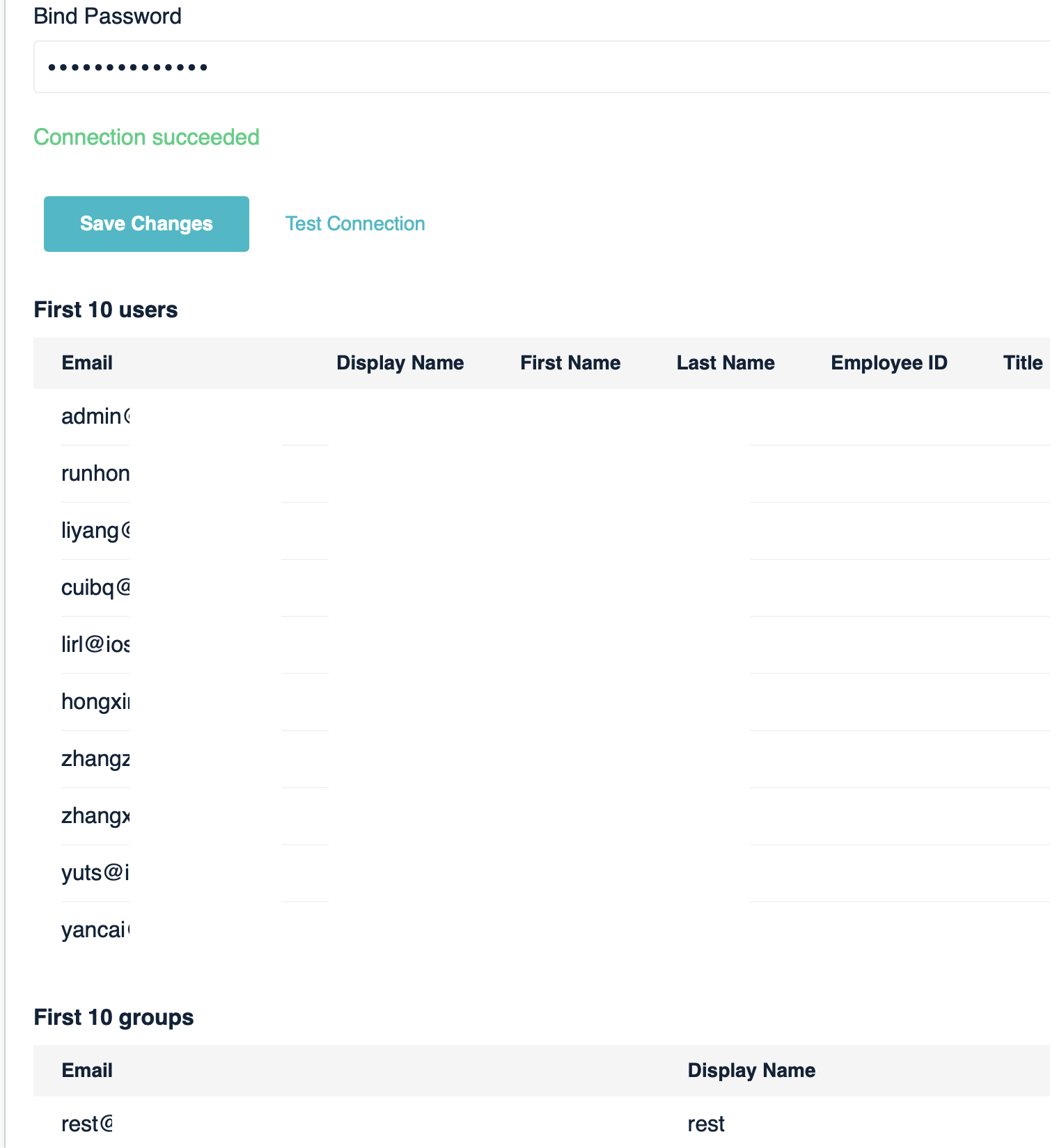 Connection succeeded, and retrieve up to 10 users and groups under the